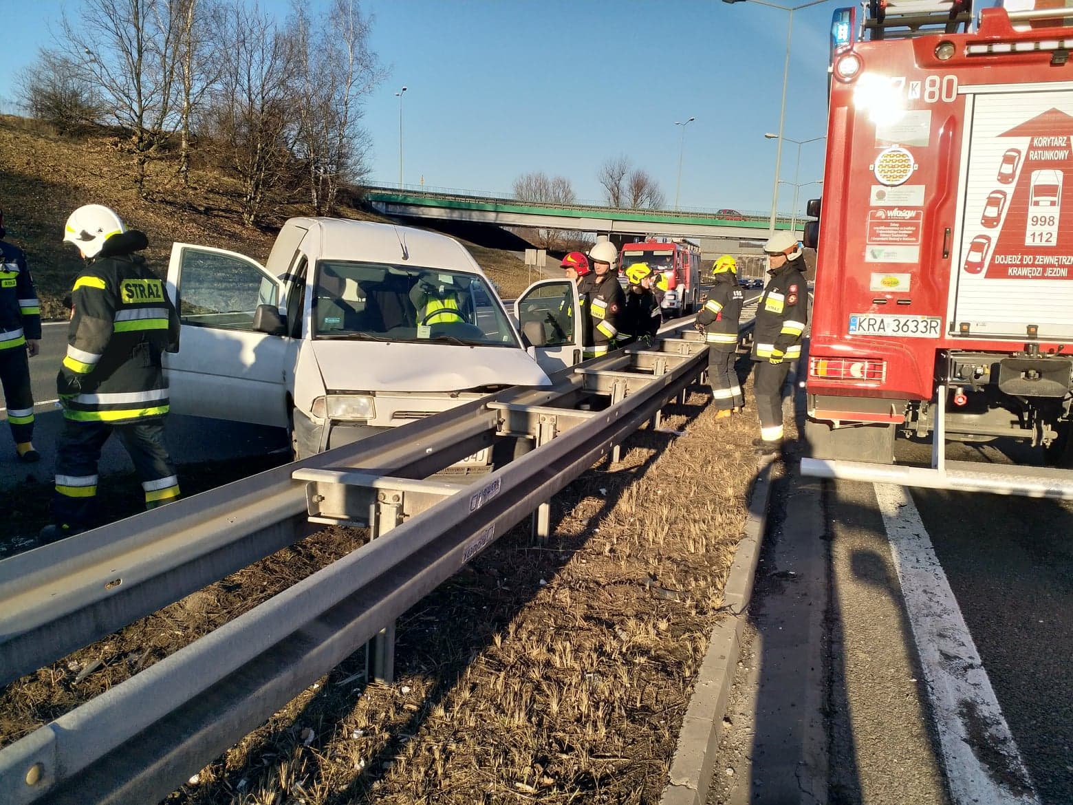 Dnia 22.02.2019 o godzinie 15:29 Stanowisko Kierowania Komendanta Miejskiego zadysponowało nasza jednostkę do kolizji samochodu dostawczego z barierami energochłonnymi na autostradzie A4 przy węźle „Balice 1 „ Nasze działania polegały na zabezpieczeniu miejsca zdarzenia, rozpięciu akumulatora w uszkodzonym pojeździe oraz neutralizacji rozlanych płynów eksploatacyjnych.